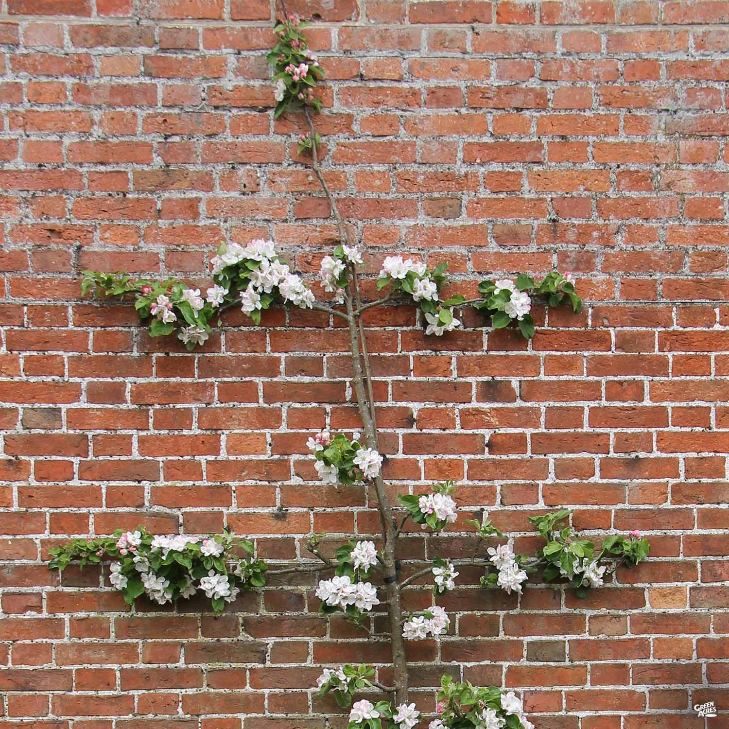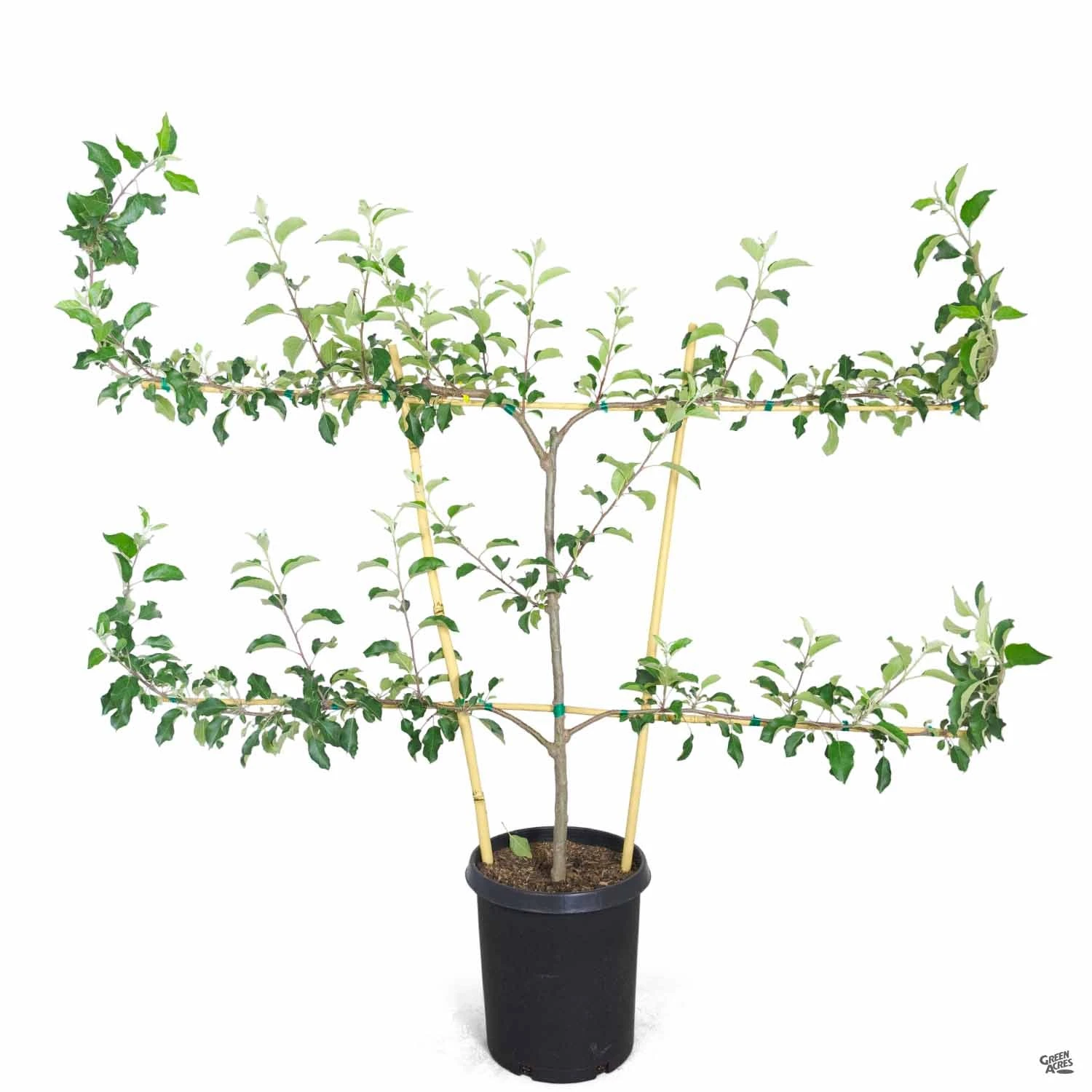 Beautiful, ornamental Fuji apple pruned to 3-tiered espalier formΒ grows outward in a flat shape. Can be planted against fence or wall to occupy otherwise unusable space. Self-fruitful tree yields crisp, reddish-orange fruits perfect for baking.Β Β