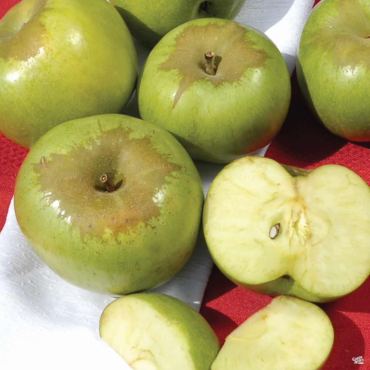 Light green, crisp, slightly tart apples adorn self-fruitful tree in late fall. For peak flavor balance, delay harvest until cheeks are blushed yellowish-green. Flavorful apples are poplar for baking.