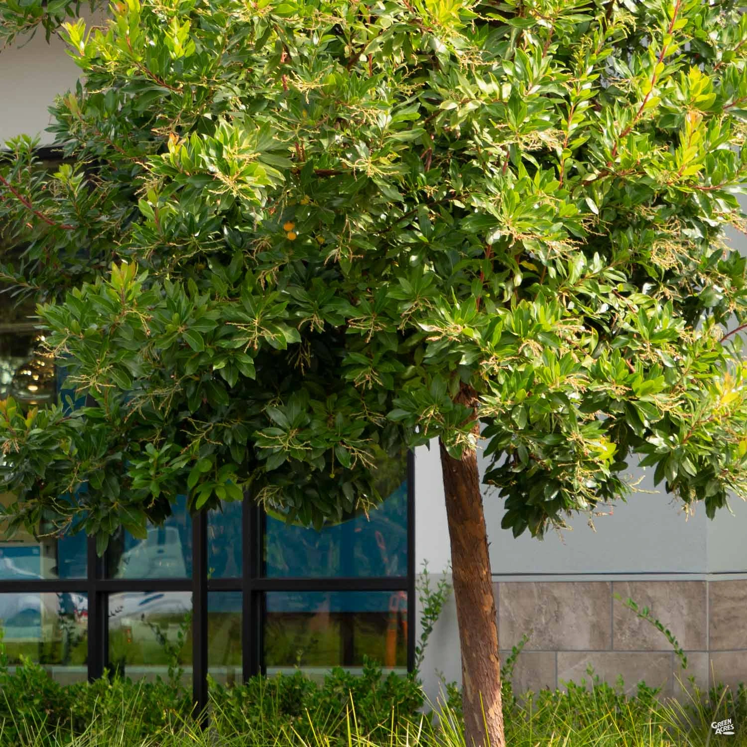Also known as a Strawberry Tree, this evergreen, standard tree with oval, deep green, glossy leaves. Smooth, mahogany, peeling bark. Showy, drooping clusters of rosy pink, urn-shaped flowers from fall to late winter. Used as screen, border or firescape. Standard tree form.