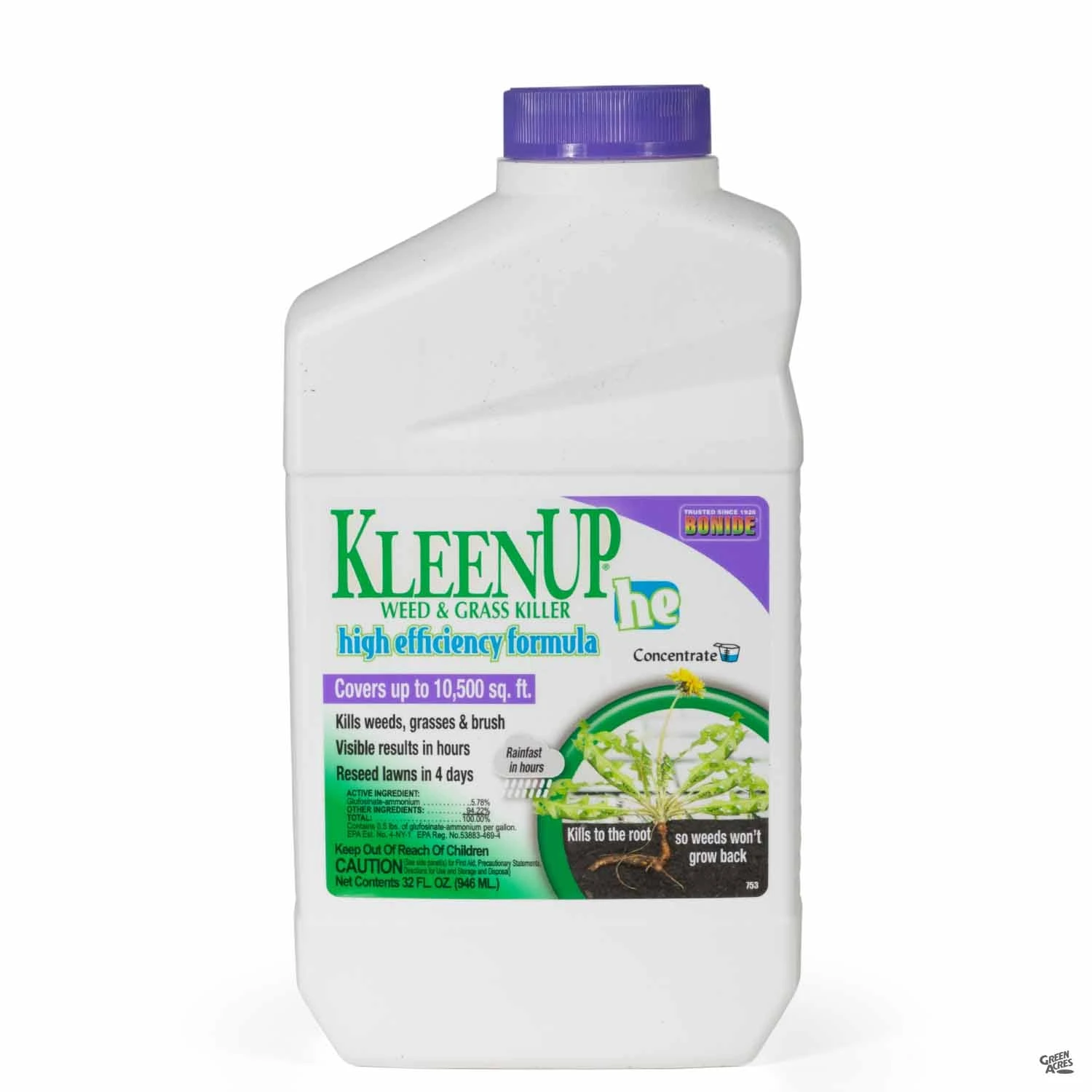 KleenUp HE (High Efficiency) is an improved formula that will kill weeds, grasses and brush in hours. Eliminate all unwanted weeds and grasses from your flowerbeds, vegetable and ornamental garden sites and more with this multipurpose weed control. Kills all green plants, roots and all, and prevents new growth. Ability to reseed seven days after treatment!