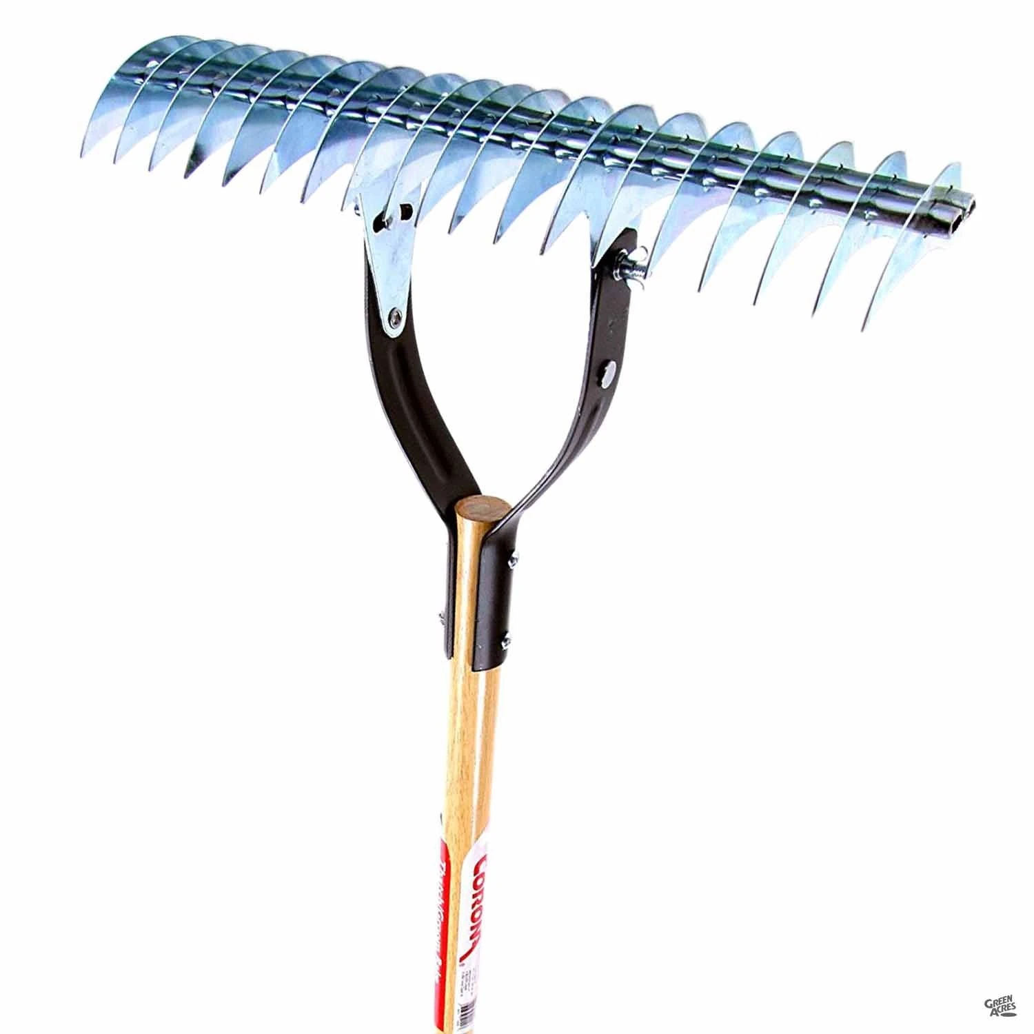 Adjustable head removes thatch and dead grass. Dethatch your lawn prior to reseeding to remove dead stems and roots, allowing air, water and nutrients to penetrate the soil. Long wood handle reduces back strain.