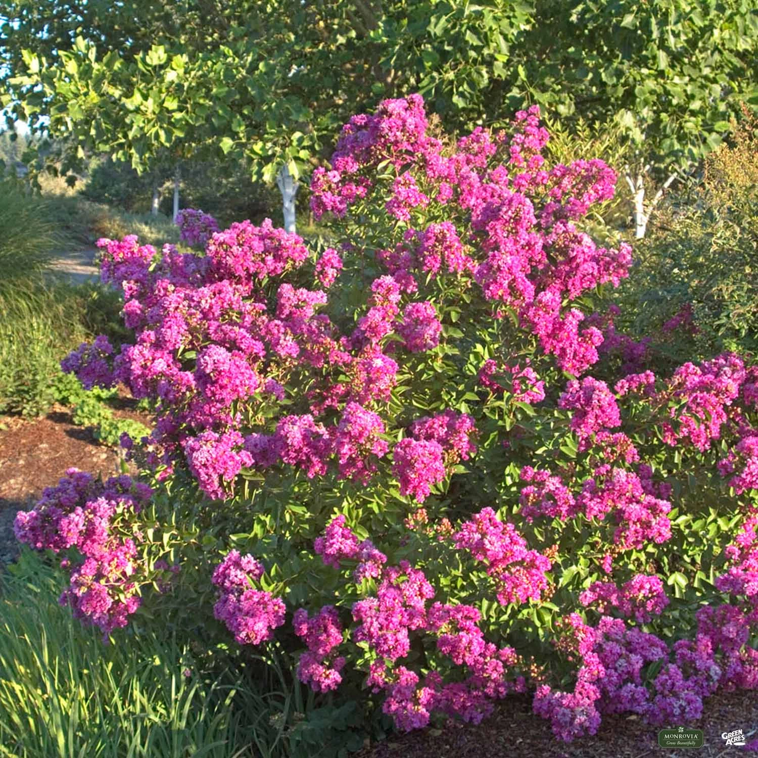 Deciduous, dwarf tree produces foliage that emerges red, ages to dark green, and turns orange in fall. Clusters of purple flowers bloom all summer. Grown in a multi-trunk form with peeling, two-toned bark. Used as an accent, lawn tree or screen.