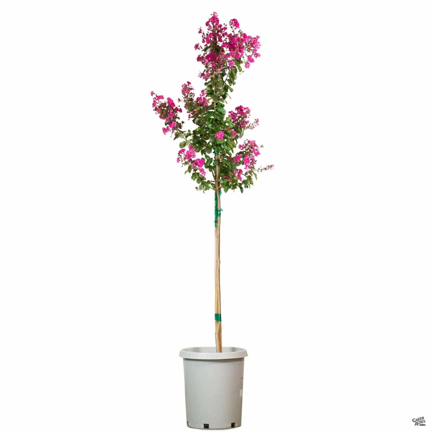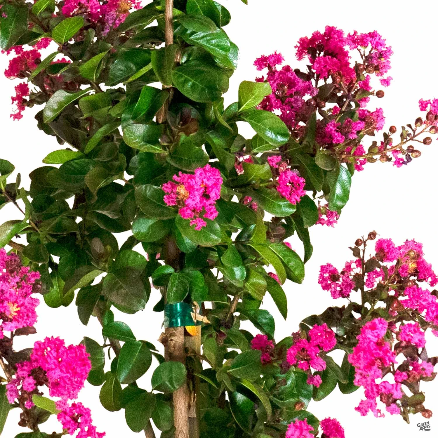 Deciduous tree produces clusters of hot-pink flowers all summer. Foliage emerges red, ages to dark green, and turns orange in fall. Grown in a single trunk form with peeling, two-toned bark. Used as an accent, lawn tree or screen.
