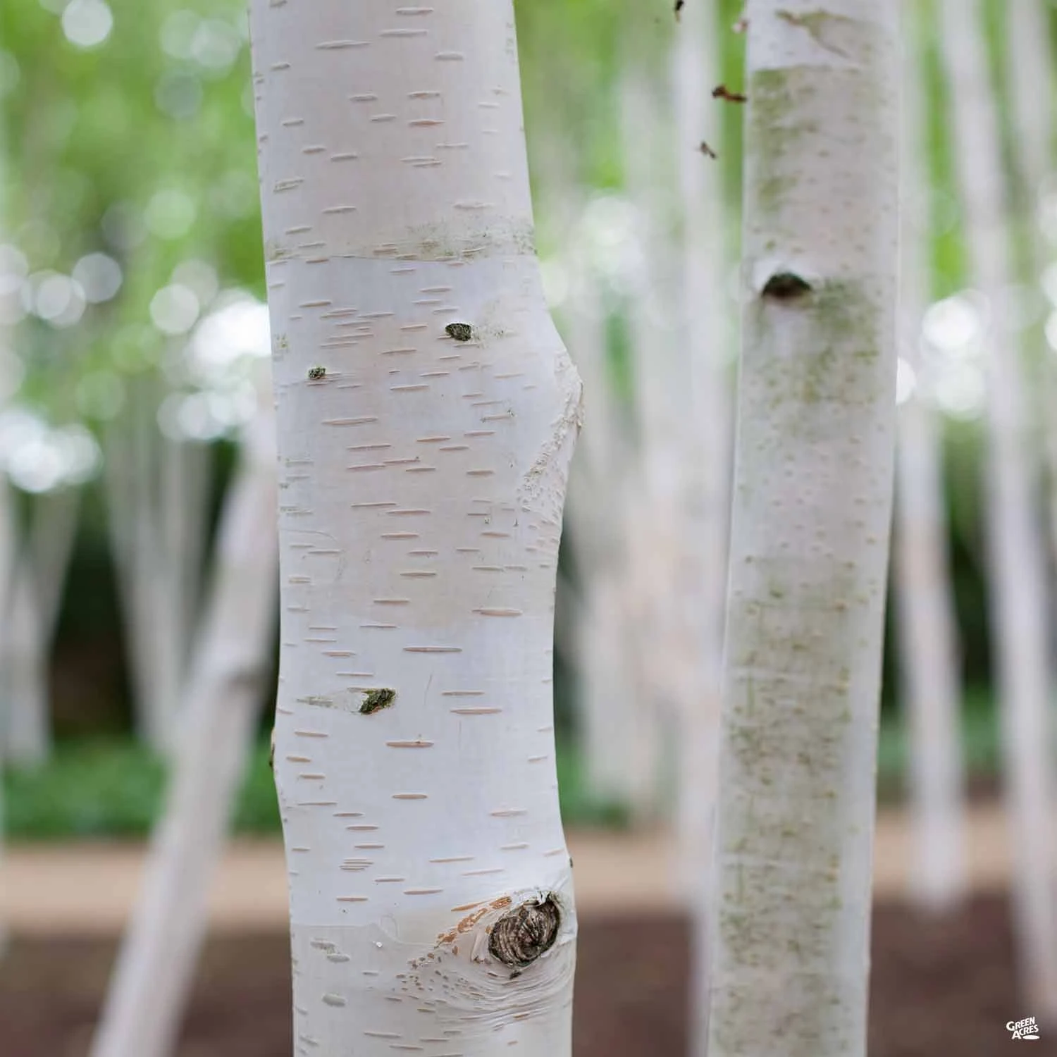 Deciduous tree known for its young, brown bark that ages to white, flakey strips. Glossy, green, serrated leaves turn yellow in fall. Yellow catkins in spring. Oval, weeping growth habit makes for an excellent accent or lawn tree. Grown in a multi-trunk form.