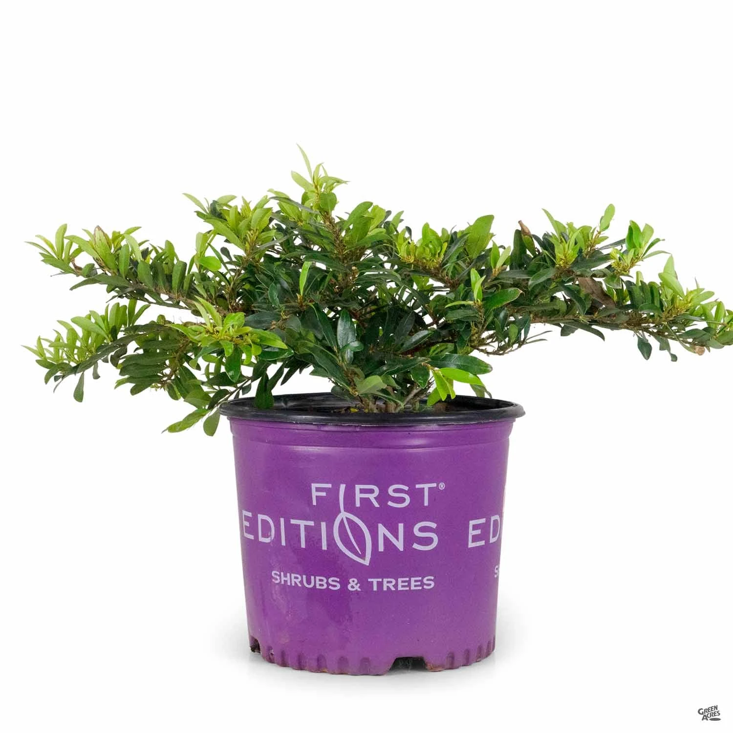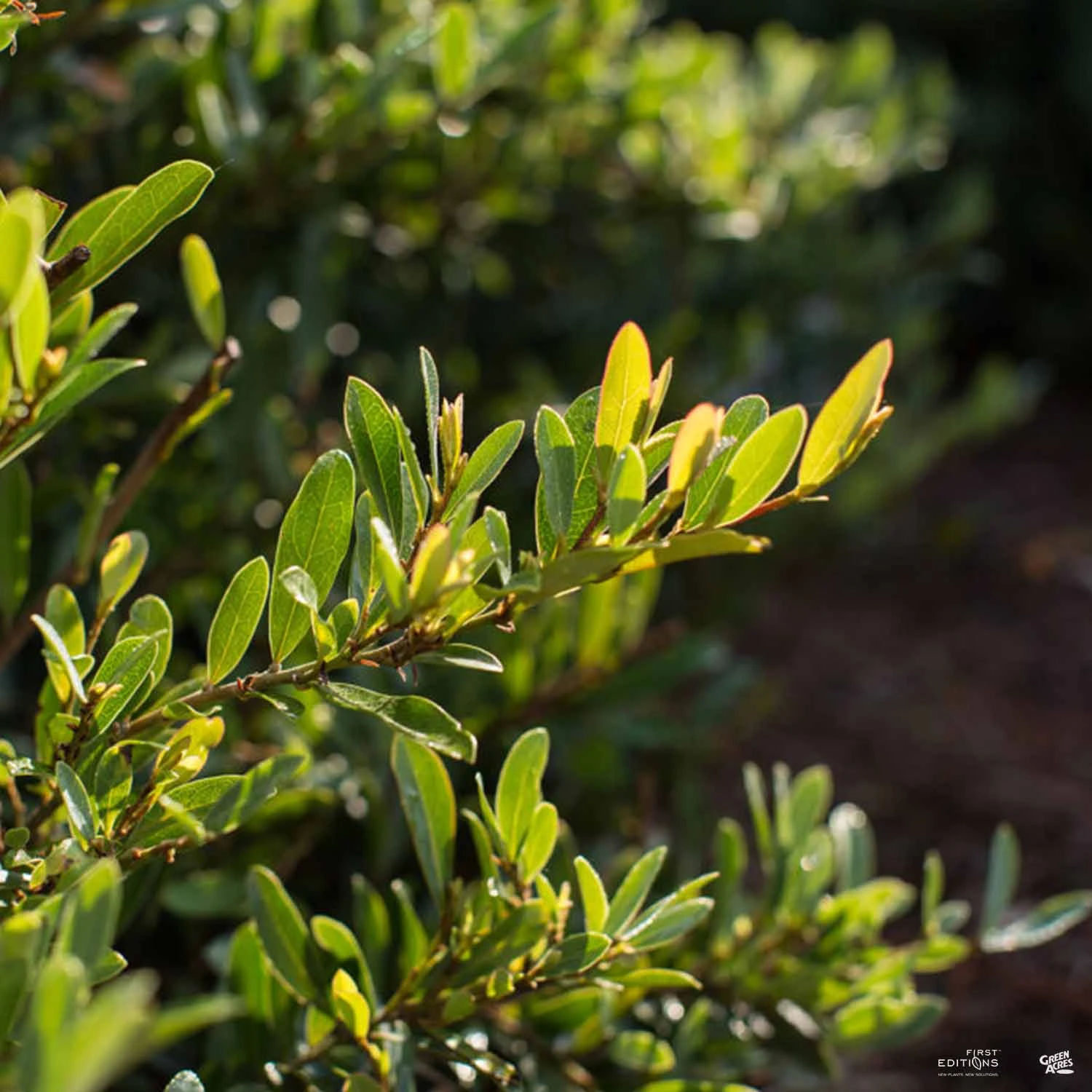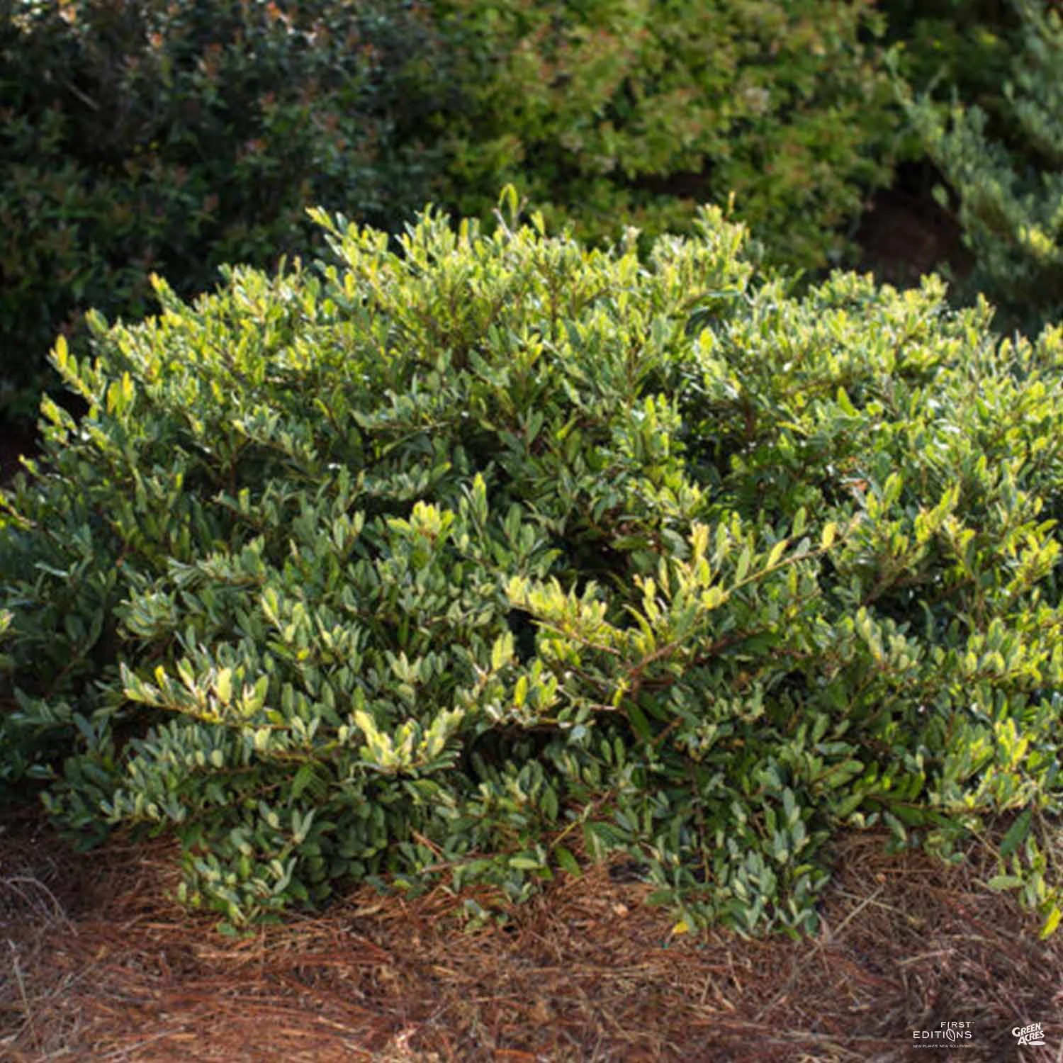 Evergreen shrub with a spreading habit. New growth emerges reddish and matures to blue-green. Petite red flowers emerge in winter. Use as a tall groundcover or low border.