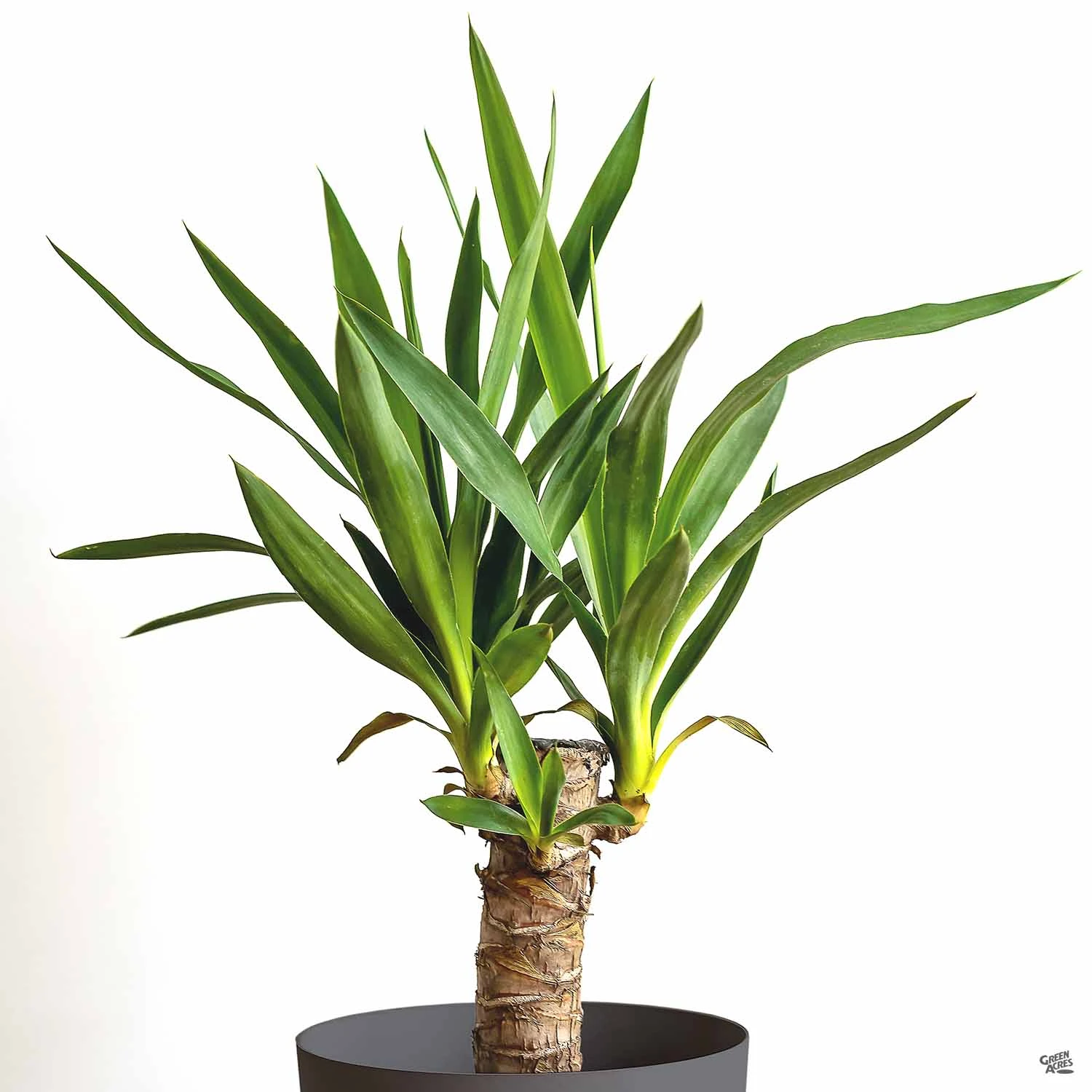 Evergreen perennial with shootsΒ that grow straight. Has a rosette ofΒ wide green leaves that grow from the central cane. The Yucca’s attractive bark is further exposed as new leaves grow to replace older leaves towards the base. Use as houseplant. Prized for its air purifying nature.Β