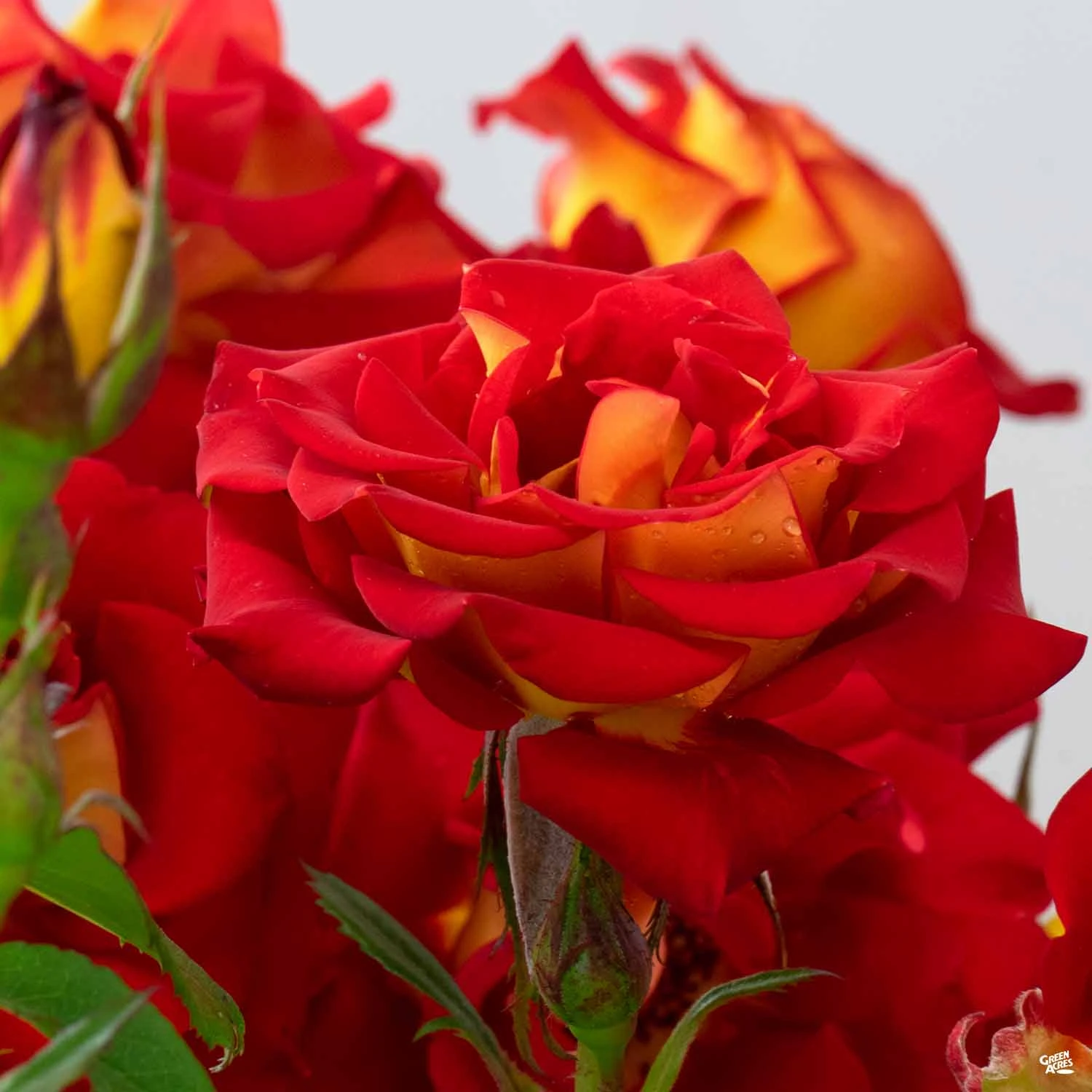 Mustard yellow buds open with a dark, ketchup red on the inside of the petals. Dark, glossy green foliage. Excellent container plant, landscape accent or border plant.
