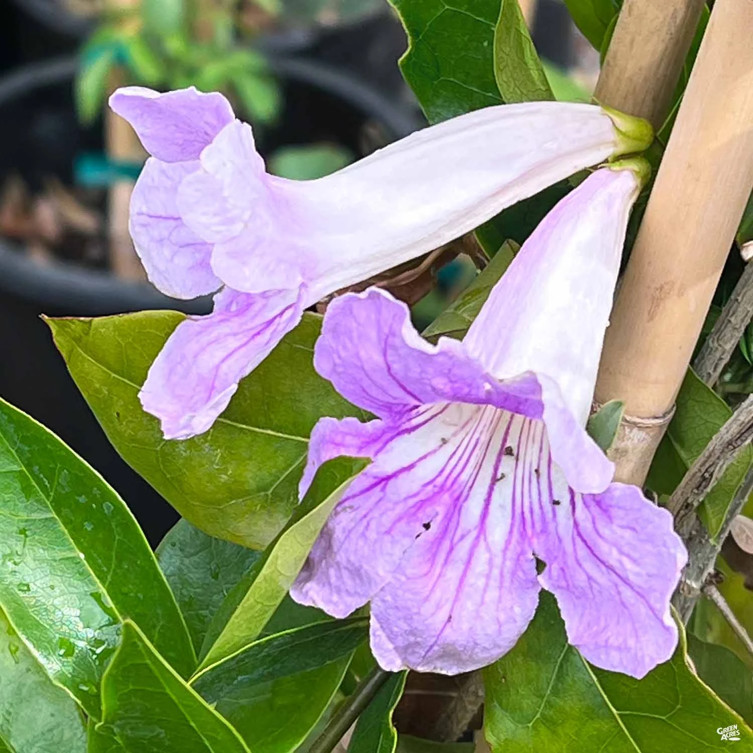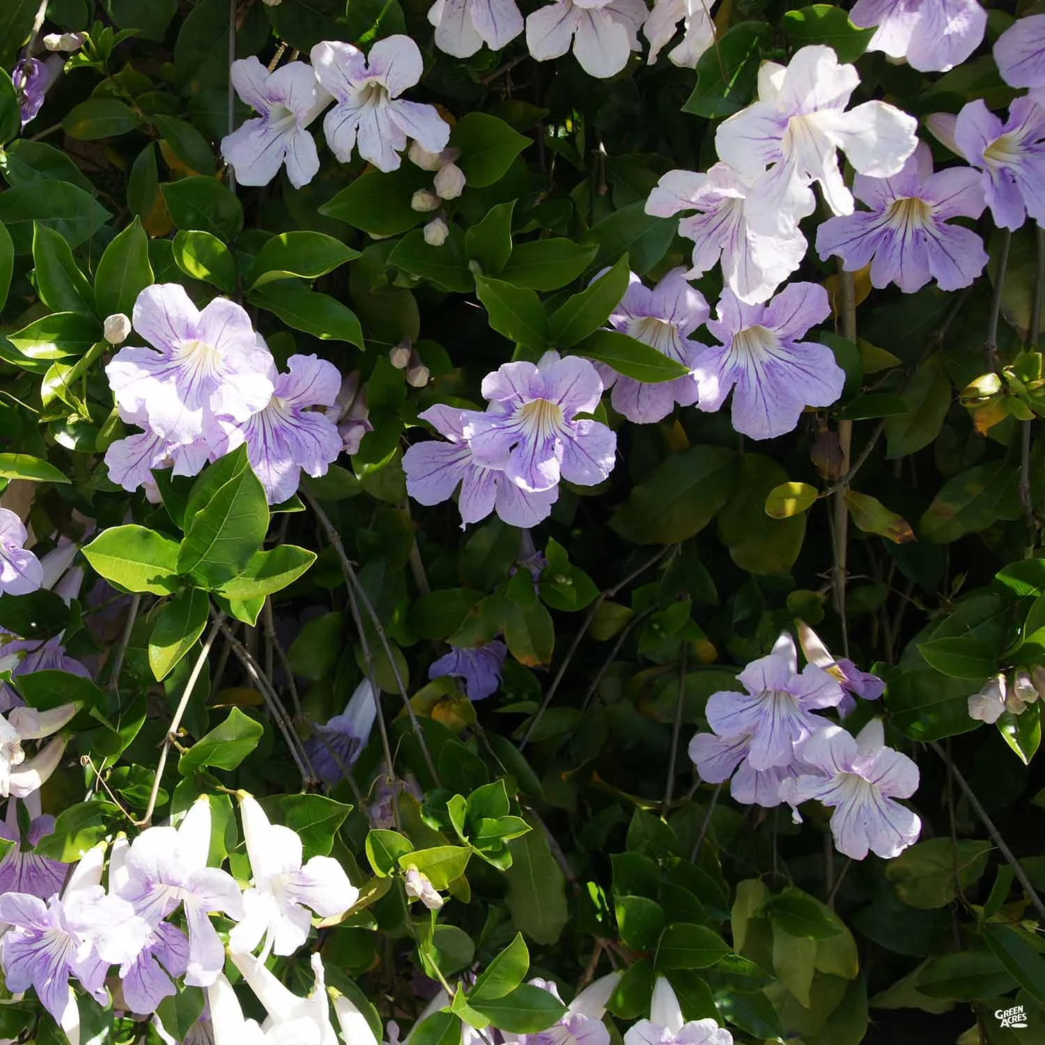 Evergreen vine with aΒ climbing habit has glossy, green leaflets.Β Lavender,Β trumpet-shapedΒ flower clusters bloom in summer and fall. Can be used as a ground cover, espalier, in containers or as a screen.
