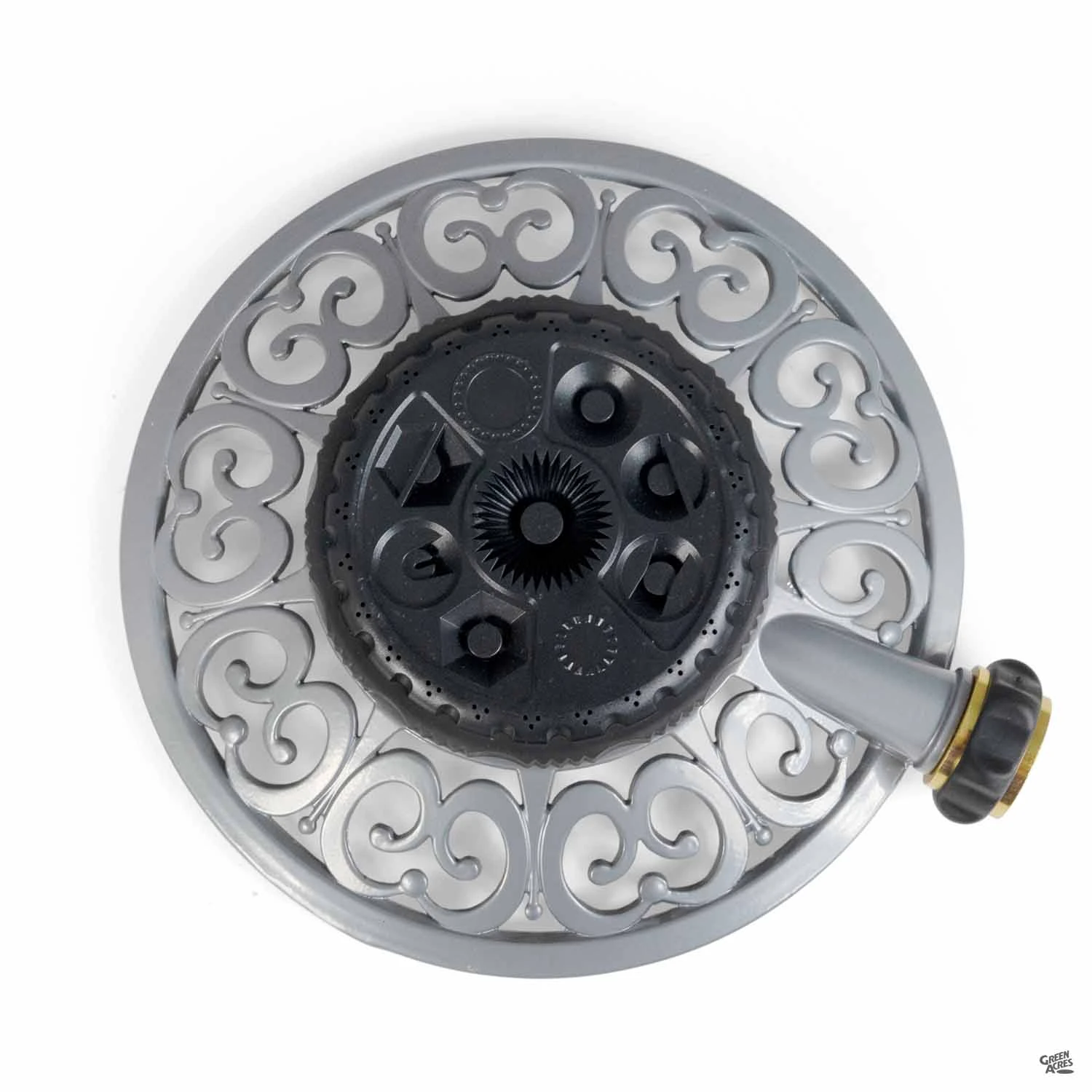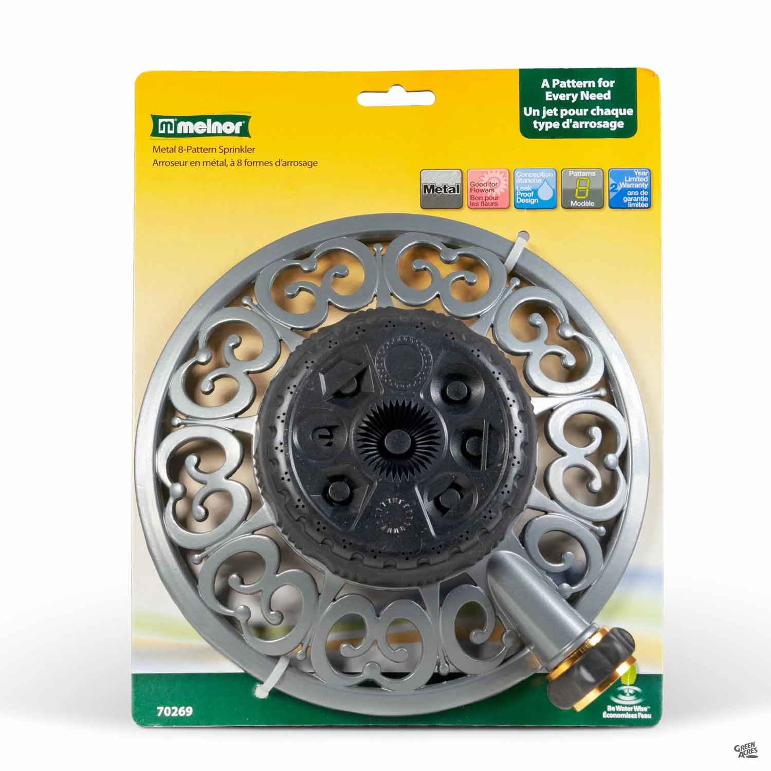 Metal constructed sprinkler with eight patterns for perfect coverage. Perfect for watering small lawns, spot watering new plantings or whole flower or vegetable garden beds.