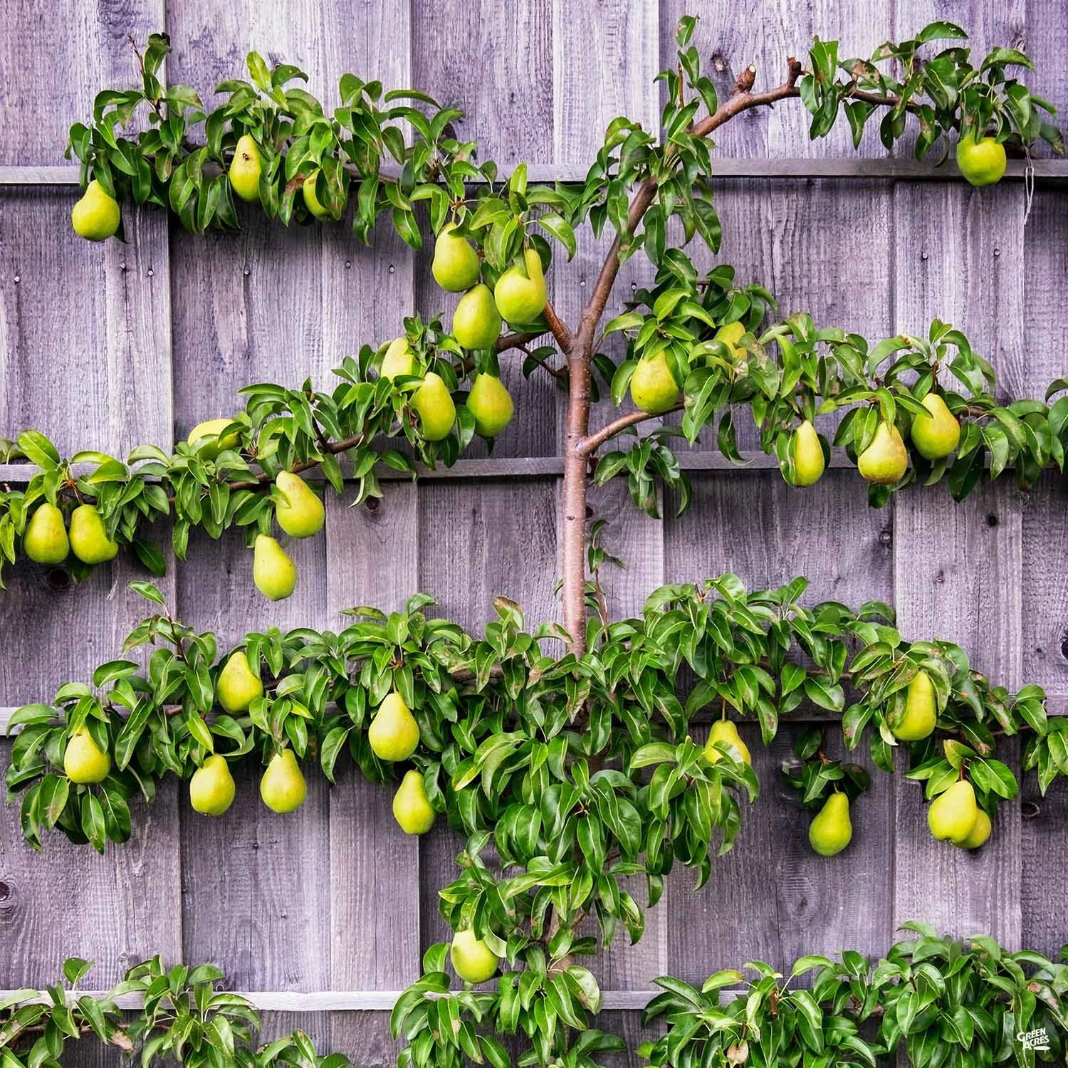 Six, self-fruiting pear varieties grafted to one tree are pruned to an ornamental, 3-tiered espalier form. Grows outward in a flat shape perfect for planting against a fence or wall to occupy otherwise unusable space.