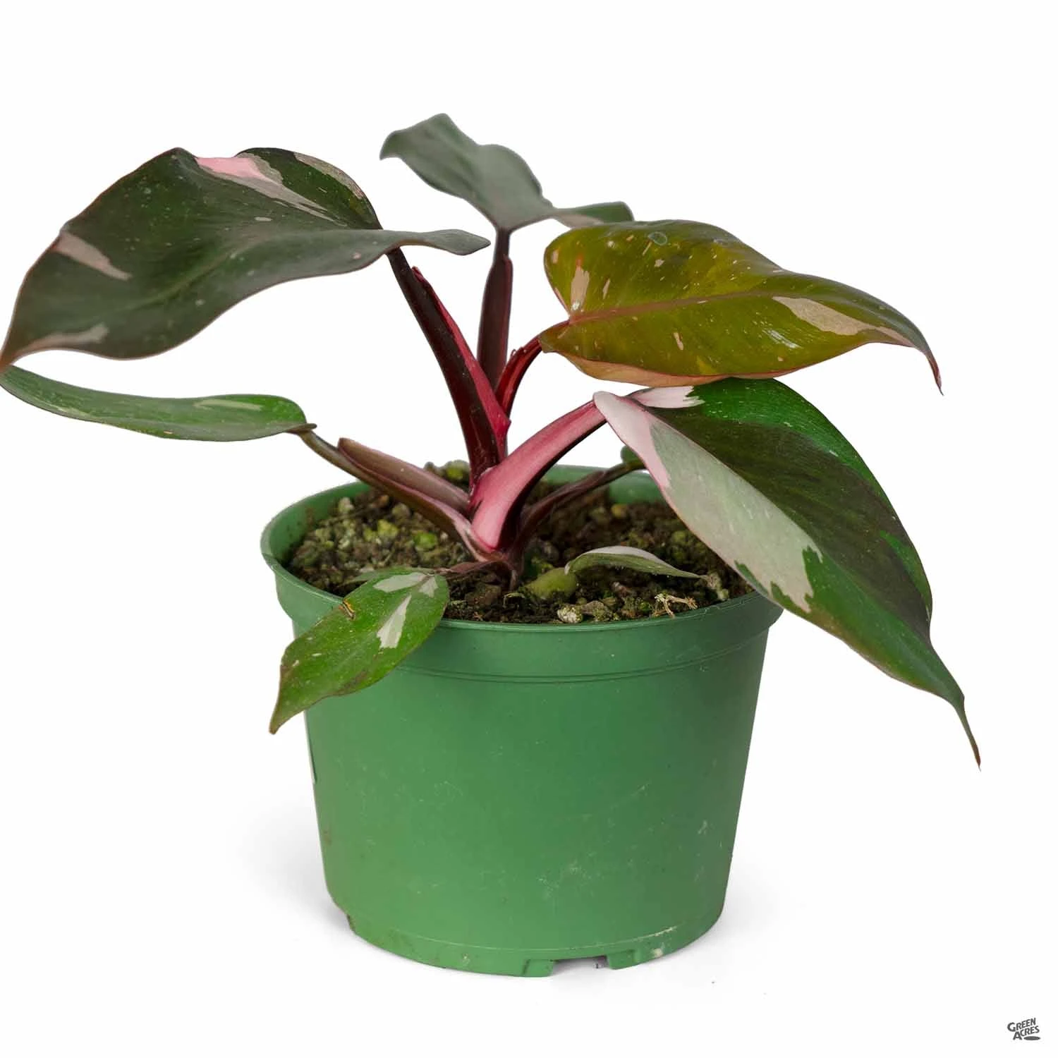 Hybrid philodendron with stunning, variable variegation and an upright, vining habit. Dark green foliage is striped and often speckled with bright pink variegation. Use trellis or moss pole to provide support as plant matures.