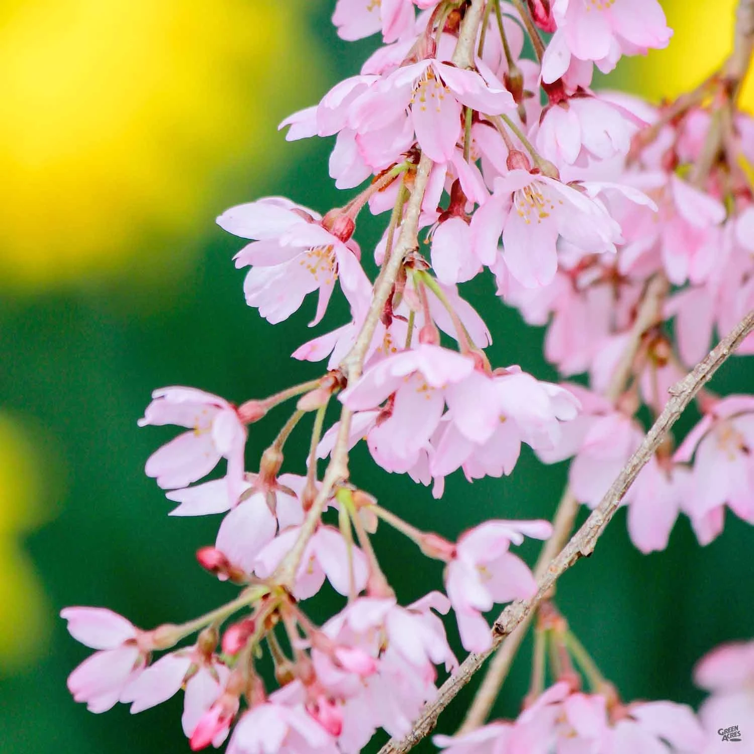 Weeping, deciduous tree with pendulous branches adorned by single, pink flowers in early spring. Peeling, mahogany-red bark provides beautiful contrast to light flowers. Show stopping accent, container or lawn tree.