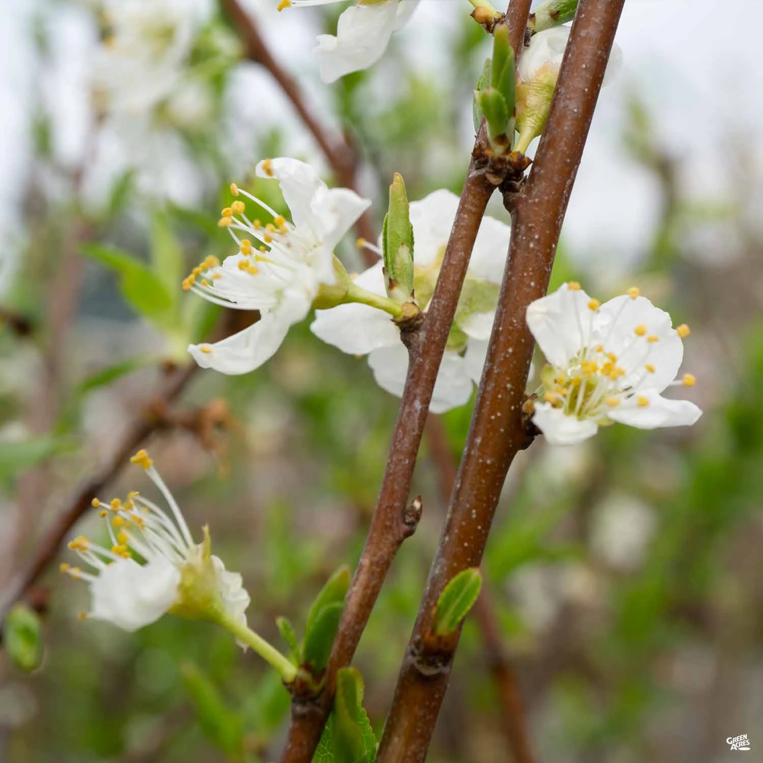Early summer brings medium sized, reddish-purple plums in abundance. Tangy fruits are excellent dehydrated or used in desserts. Does not need a pollinizerΒ to be fruitful.