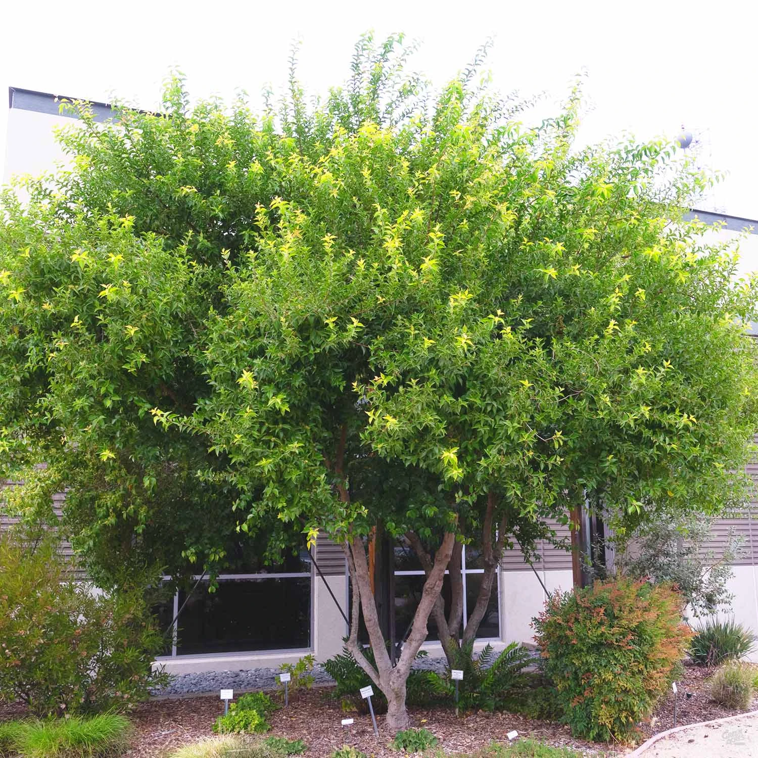 Shiny, pointed foliage emerges red, maturing to a yellowish-green. Semievergreen shrub is trained into a small, single-trunked tree. Grows with a graceful, arching habit.