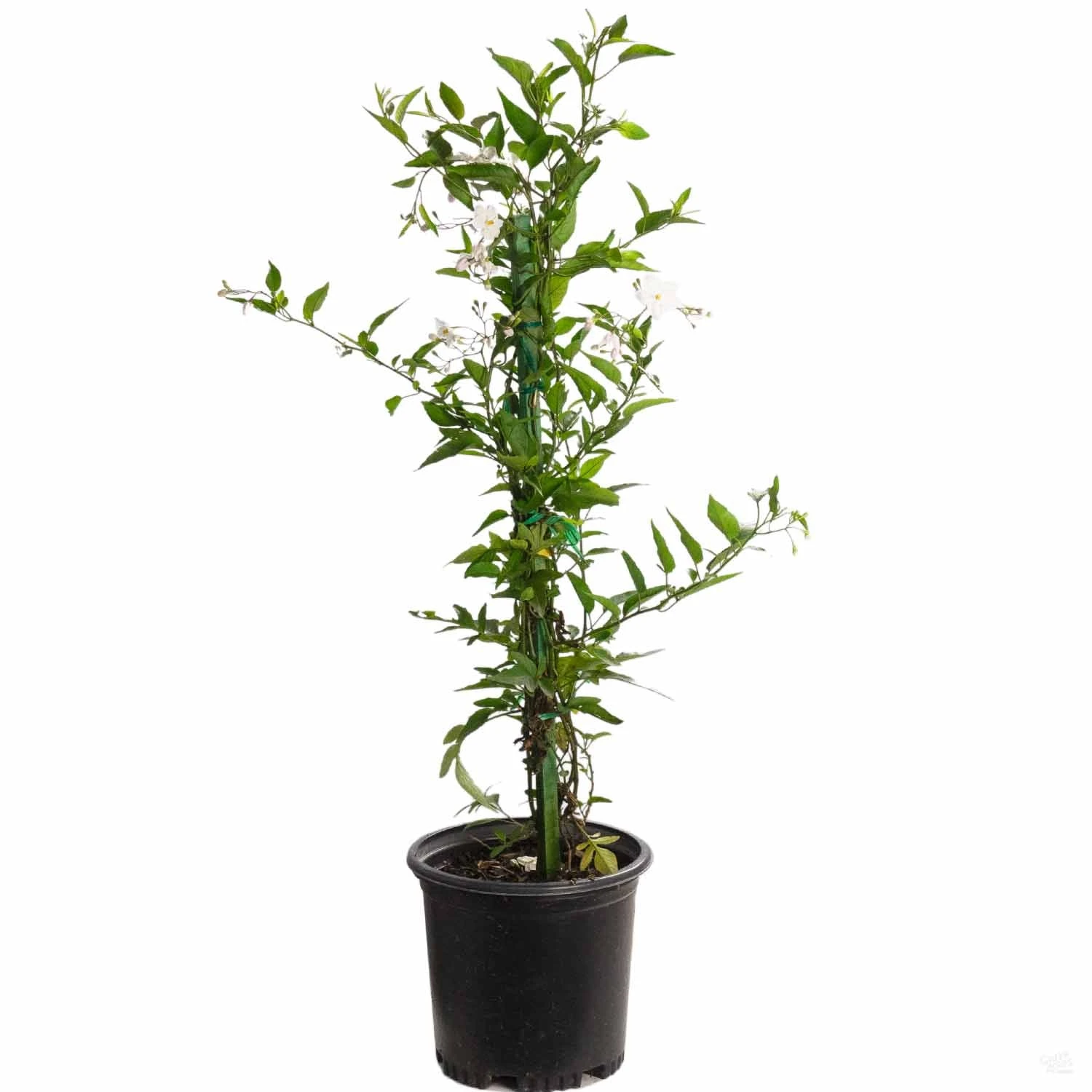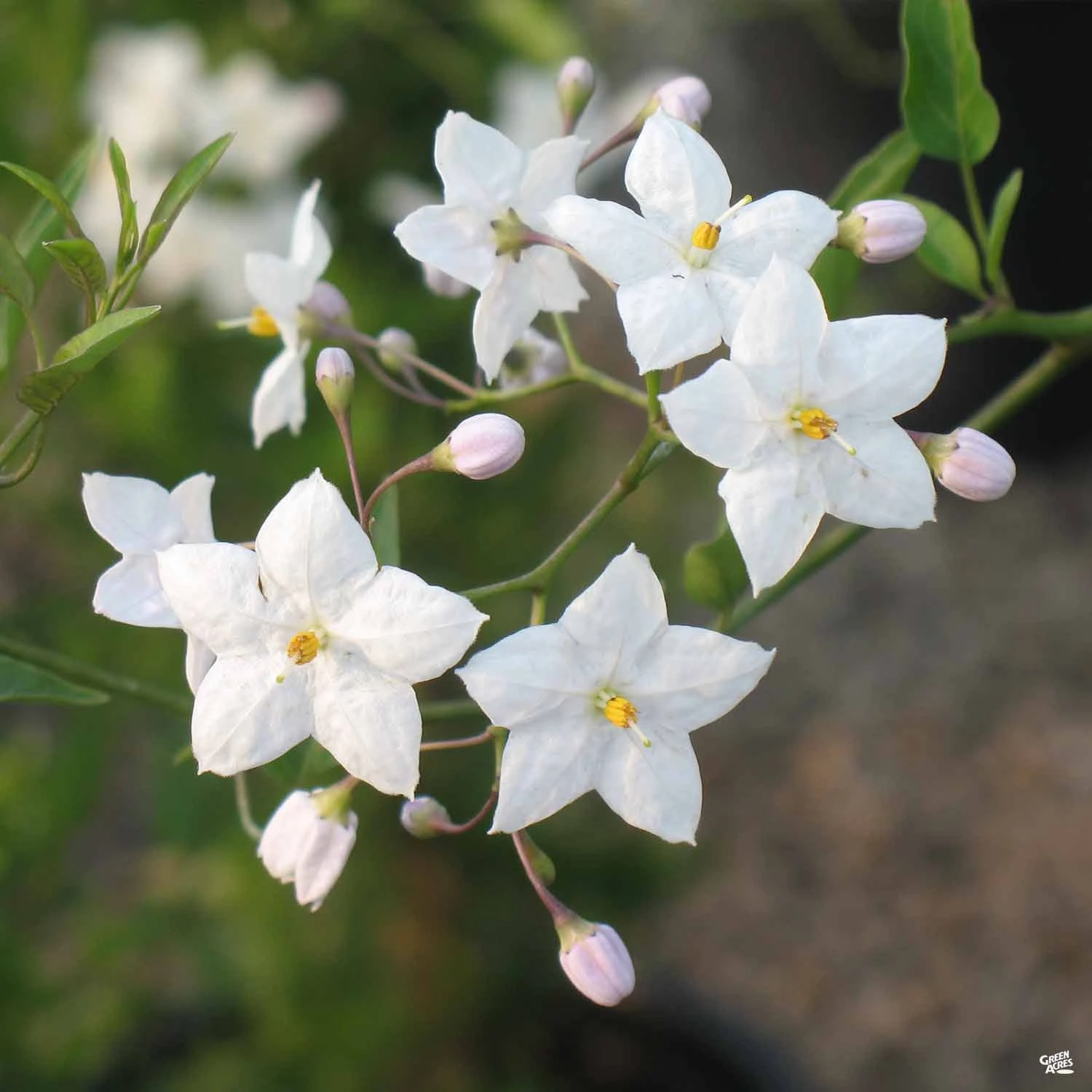 Evergreen vine with matte, deep-green leaves. White, star-shaped flowers with a yellow center, bloom mostly in spring and intermittently the rest of the year. Use as a screen.